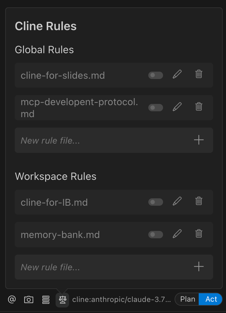 This popover shows active global and local rules and lets you enable or disable them with a click. Add new rules easily (Cline can write them!) and activate them only when relevant.
