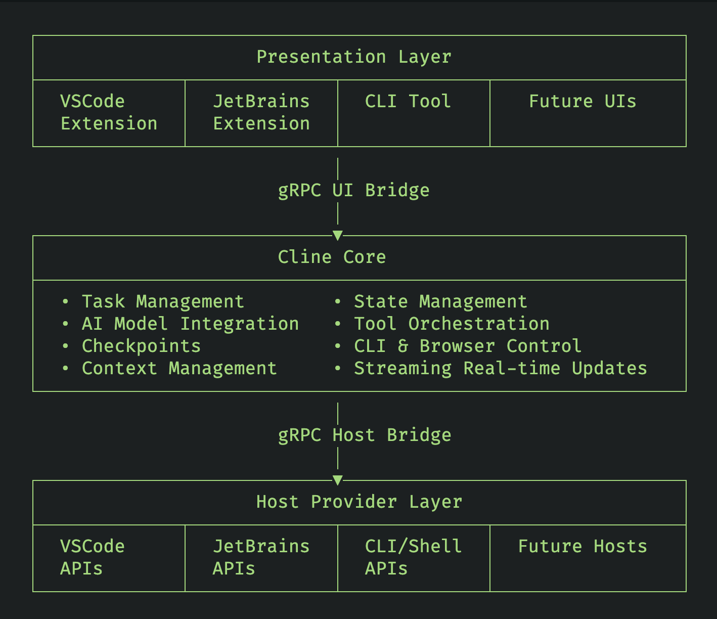 Cline Core connects as a gRPC client to the "Host Provider Layer" which implements integration into what he's being embedded into. So, for example, Cline Core can ask VS Code to provide the linter output. We also provide a generic host provider with the Cline CLI, so you don't have to implement this if you don't want to.