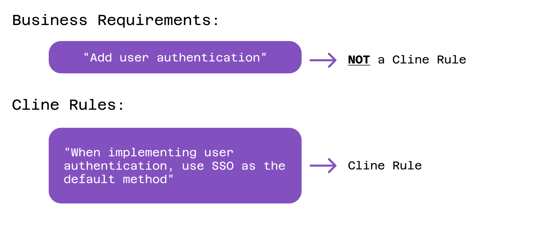 One important distinction to keep in mind is the difference between rules and requirements. Cline Rules focus on how code should be written and how systems should be modified – the technical standards and practices that govern implementation.