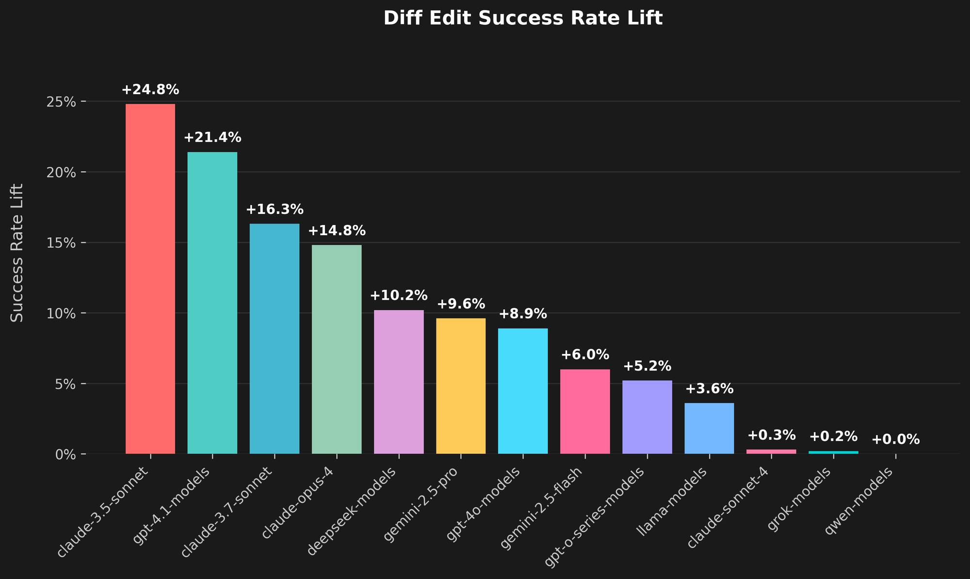 The data shows a clear lift across the board. For users connecting Cline to Claude 3.5 Sonnet, the success rate of diff edits has increased by nearly 25%. Other models show significant gains as well, with GPT-4.1 models improving by over 21% and Claude Opus 4 by almost 15%.