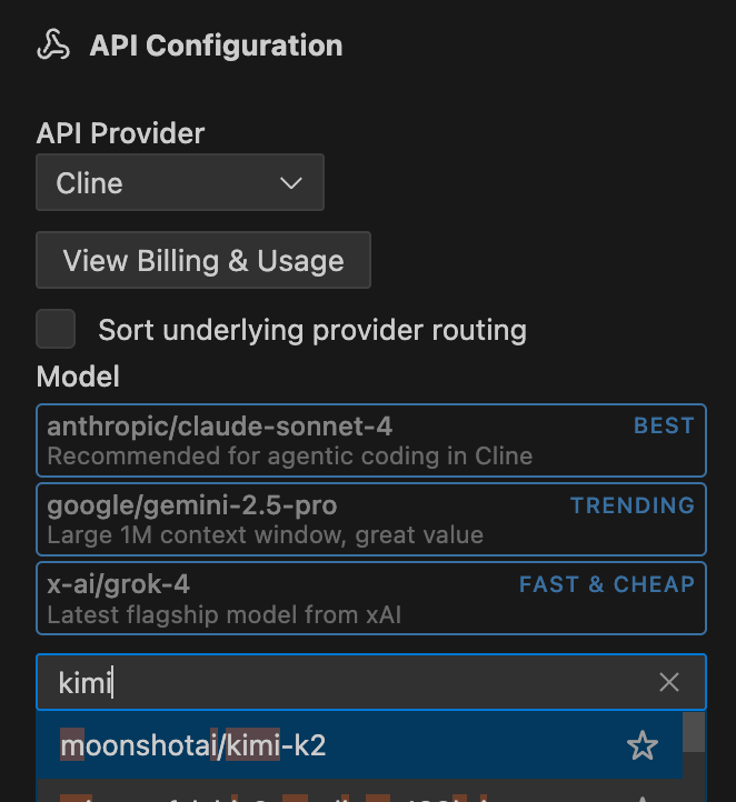 Simply select cline:moonshotai/kimi-k2 from the model dropdown menu.