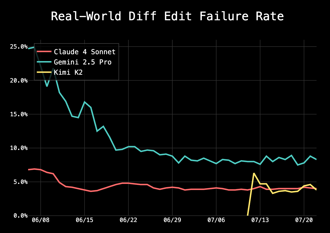After analyzing over a week of production data from thousands of Cline users, Kimi K2 is delivering surprising results. In real-world diff editing tasks — the complex search-and-replace operations that challenge even frontier models — Kimi K2 is achieving failure rates as low as 3.3%, matching and occasionally outperforming Claude 4 Sonnet.