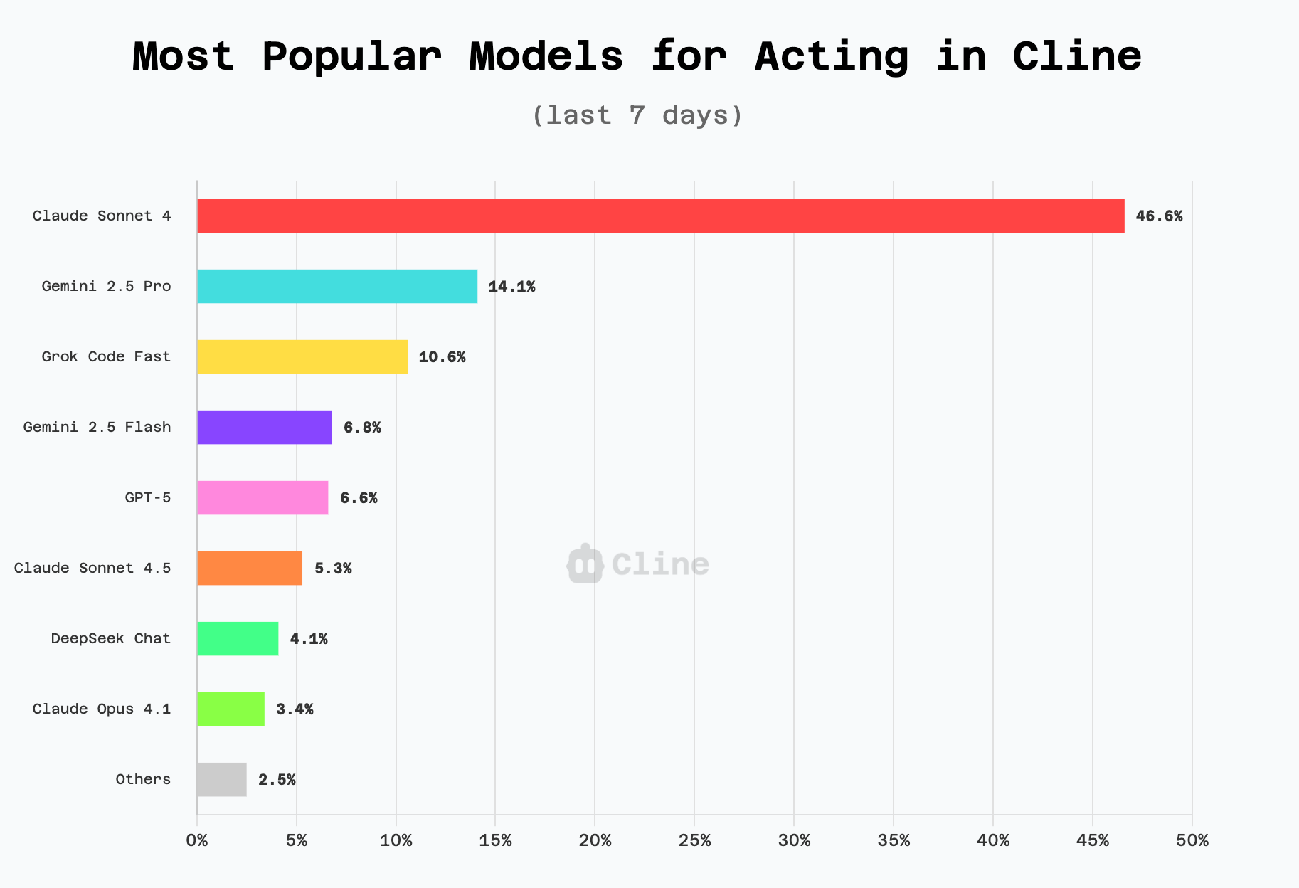 Execution patterns show even stronger concentration, with Claude Sonnet 4 handling 46.6% of all Act mode tasks. We expect Sonnet 4.5 to replace Sonnet 4's usage over the coming weeks for Acting as well as Planning.