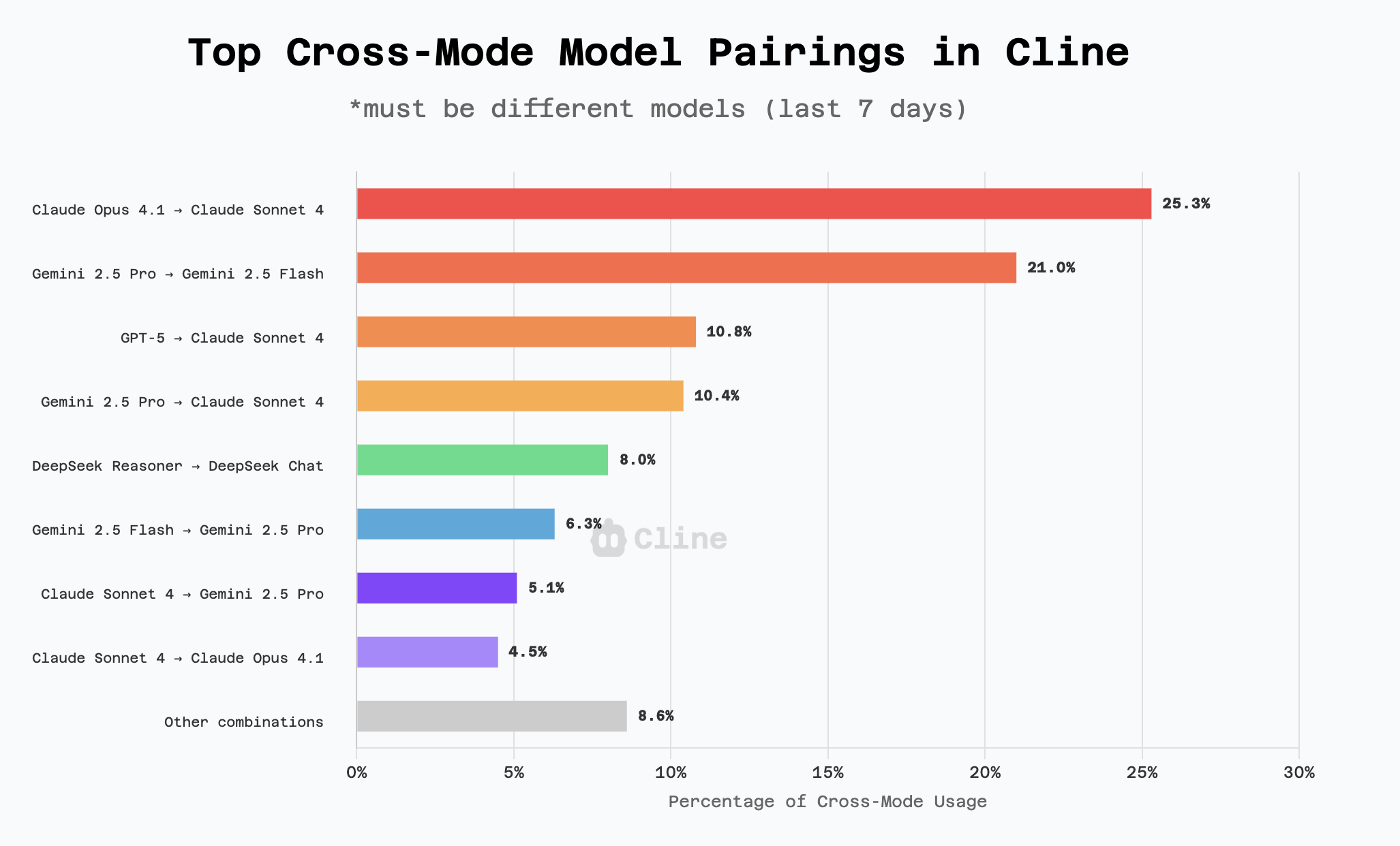 When developers choose different models for Plan vs Act, specific patterns emerge. The Claude Opus 4.1 → Claude Sonnet 4 combination leads at 25.3% of all cross-mode usage.