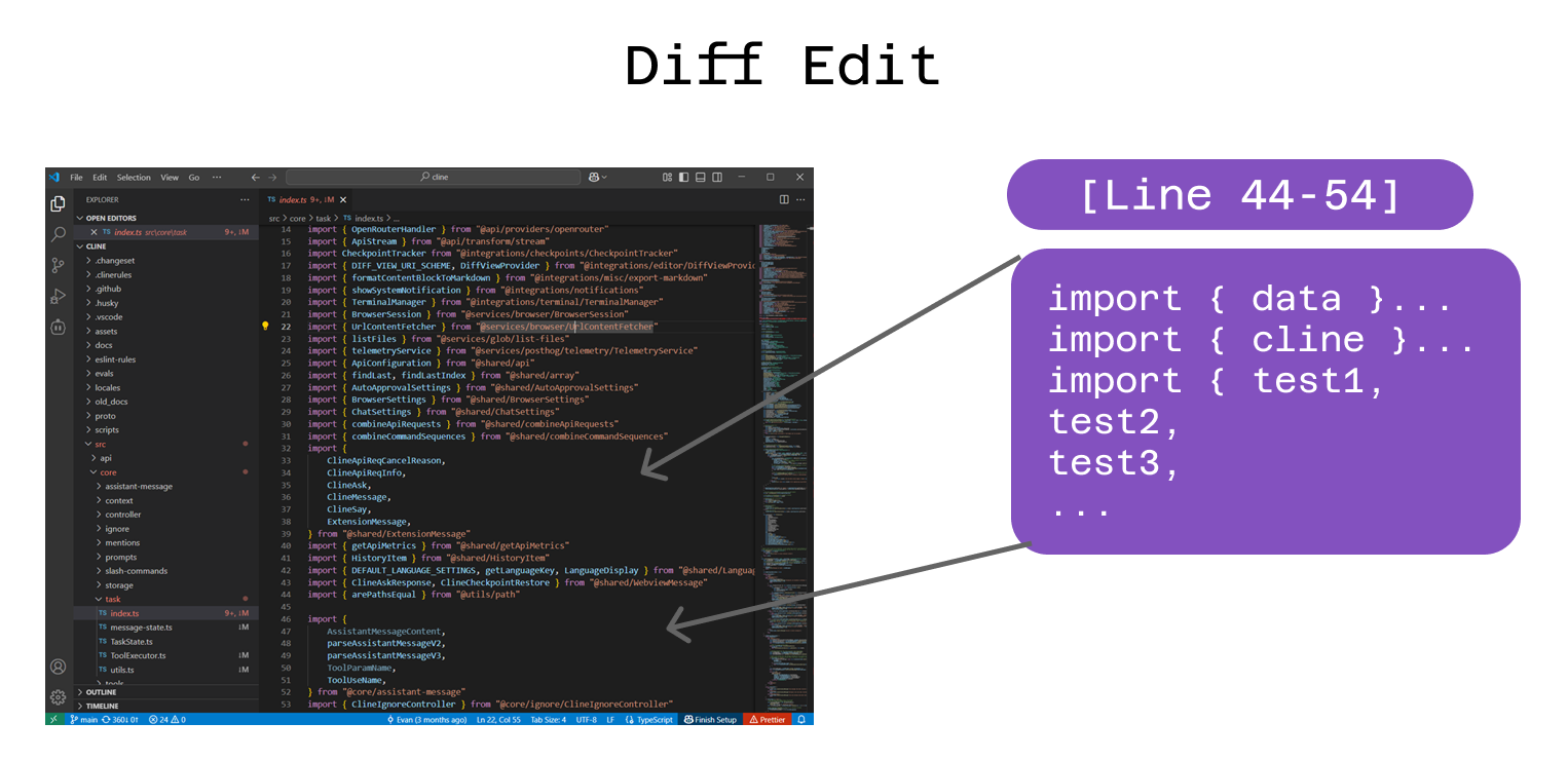 Rather than rewriting entire files, Cline employs a technique called diff editing. This approach identifies the specific sections of code that need to change and modifies only those sections, leaving the rest of the file untouched.